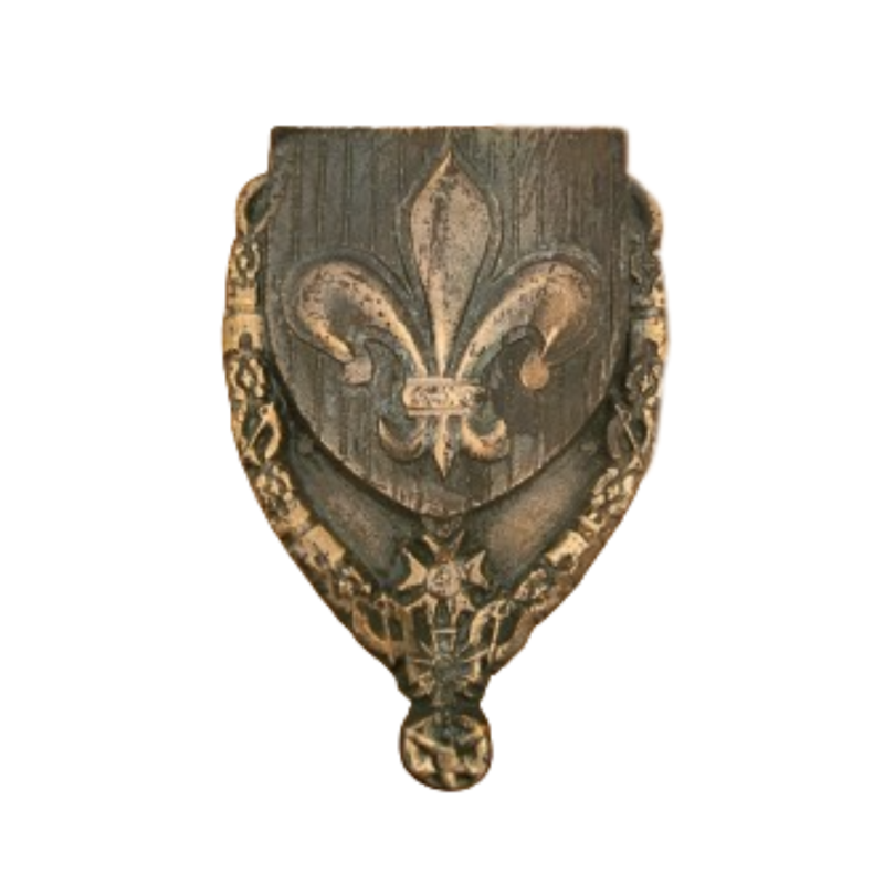 Other foundry items Bas-reliefs and Escutcheons Bas-reliefs and Escutcheons Fleur-de-lys escutcheon Ref : Écusson fleur de lys Fleur de lys escutcheon in patinated and varnished bronze (12 x 8 cm). Specify your request Add to cart Description