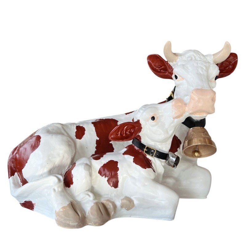 Lying cow and calf in resin (30 x 44 cm). An emblematic decorative set hand-painted by a local farmer. The cow and calf are varnished for strength, durability and waterproofing. They can be displayed indoors or out, just like the cows you can see at the front of our store! The calf wears a small steel bell around its neck, and the cow a small bronze bell made in our foundry.